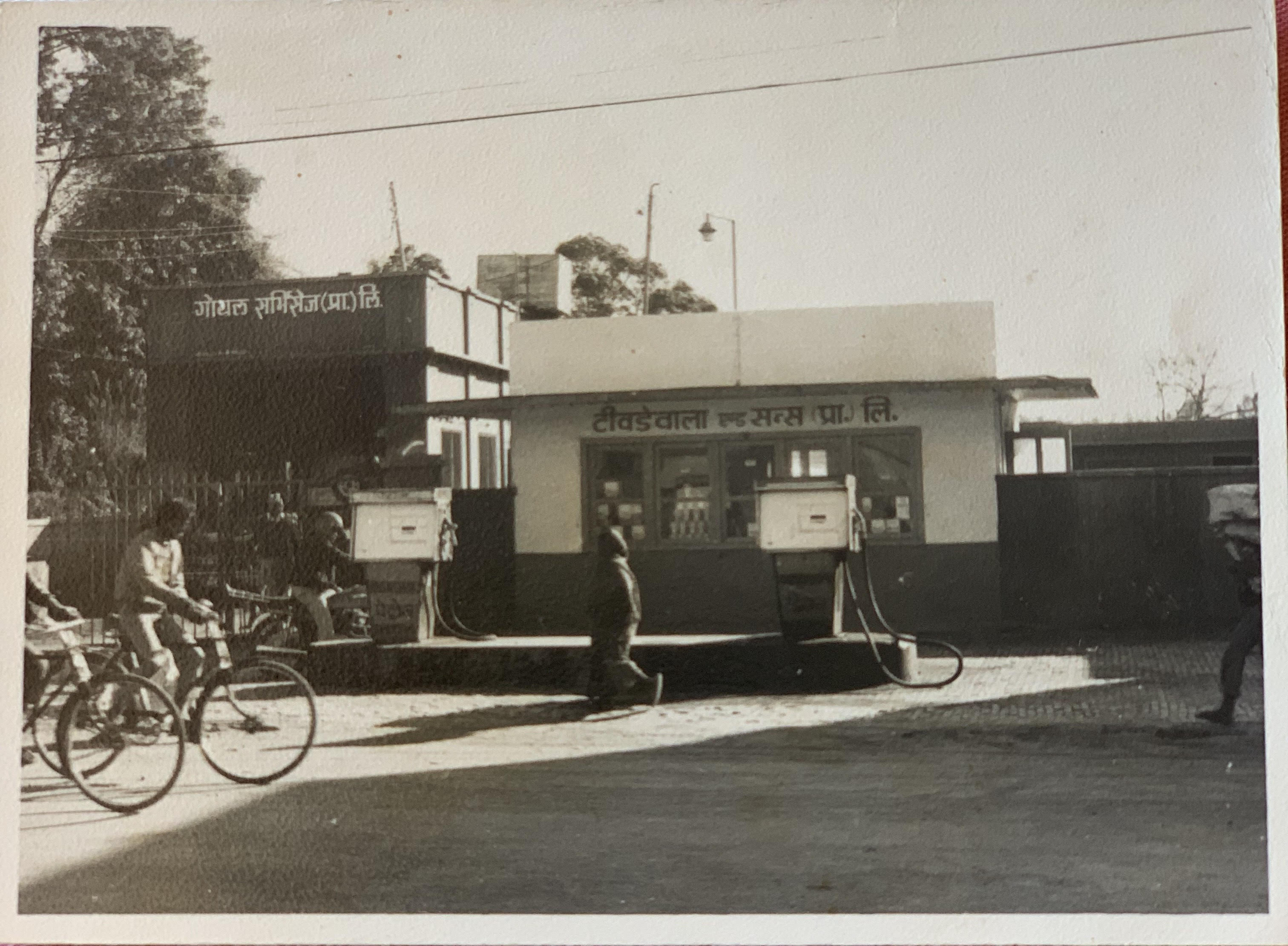 सन् ७० दशकमा त्रिपुरेश्वरको टीवडेवाला एन्ड सन्स– पेट्रोल पम्प र सर्भिस स्टेसन। हाल यो ठाउँमा साकेत कम्प्लेक्स भवन छ। तस्बिर सौजन्य: शरद टिवडेवाला