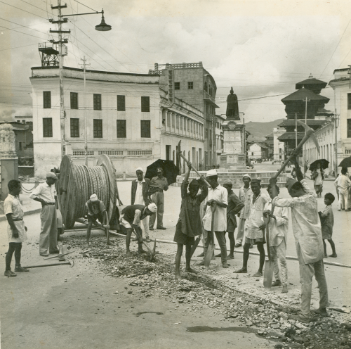 सन् १९५९ मा न्यूरोडमा टेलिफोन लाइन बिछ्याइँदै। त्यसपछि काठमाडौंमा हजारवटा टेलिफोन लाइनको सुविधा सुरू भएको थियो। तस्बिर सौजन्य: युएसएड/नेपाल वेबसाइट