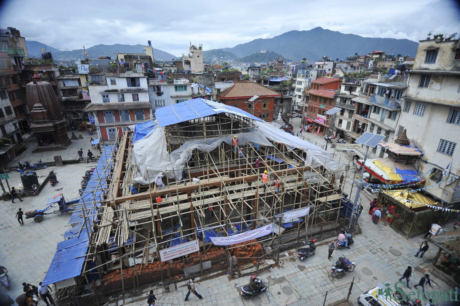 भुइँचालोपछि पुनर्निर्माण हुँदै गरेको काष्ठमण्डप। तस्बिर: नारायण महर्जन/सेतोपाटी