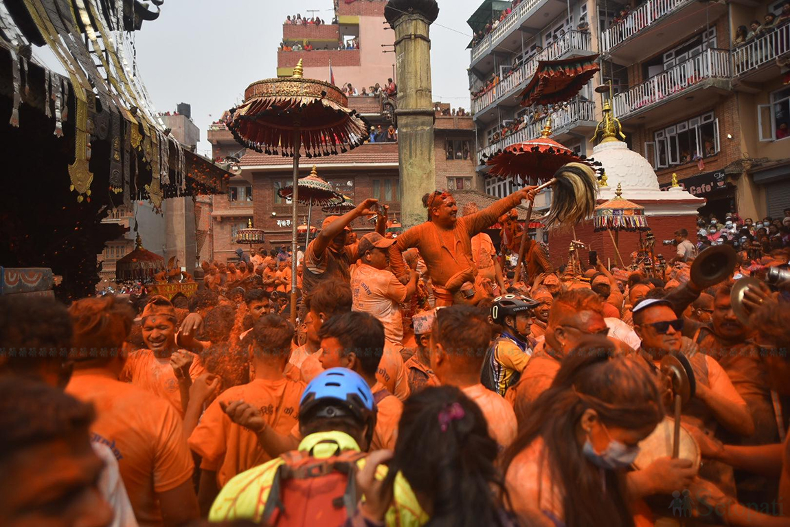 मध्यपुर थिमिमा खटजात्रा । हरेक वर्ष मध्यपुर थिमिमा मनाइने बिस्का: जात्रा अन्तर्गत वैशाख २ गते शनिबार सुथसिया (बिहानको जात्रा) जात्रामा बालकुमारी मन्दिरमा खटजात्रा गर्दै स्थानीय। तस्बिर: निशा भण्डारी/ सेतोपाटी