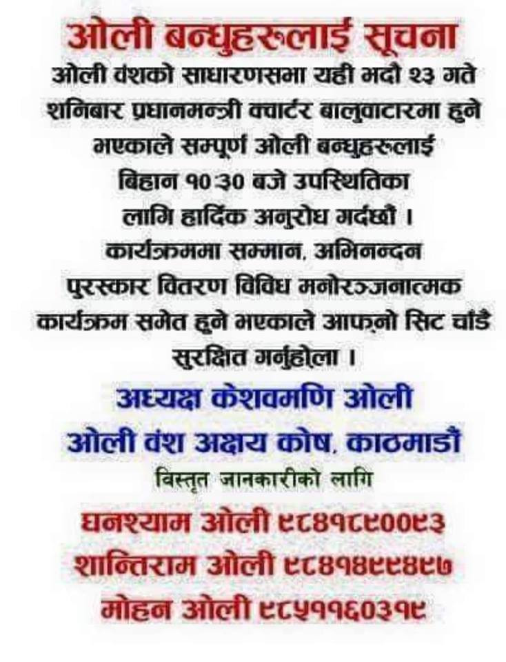 सामाजिक सञ्जालमा ओली वंशको साधारण सभाबारे सूचना राखिएको छ।