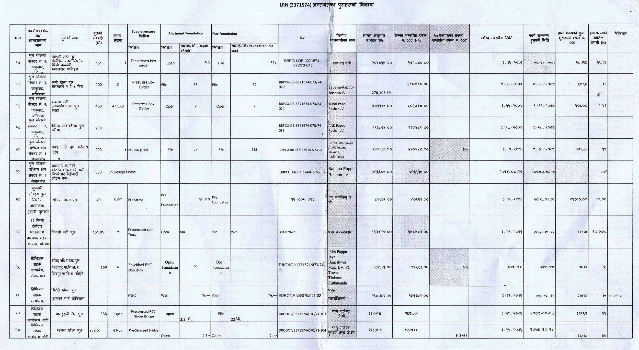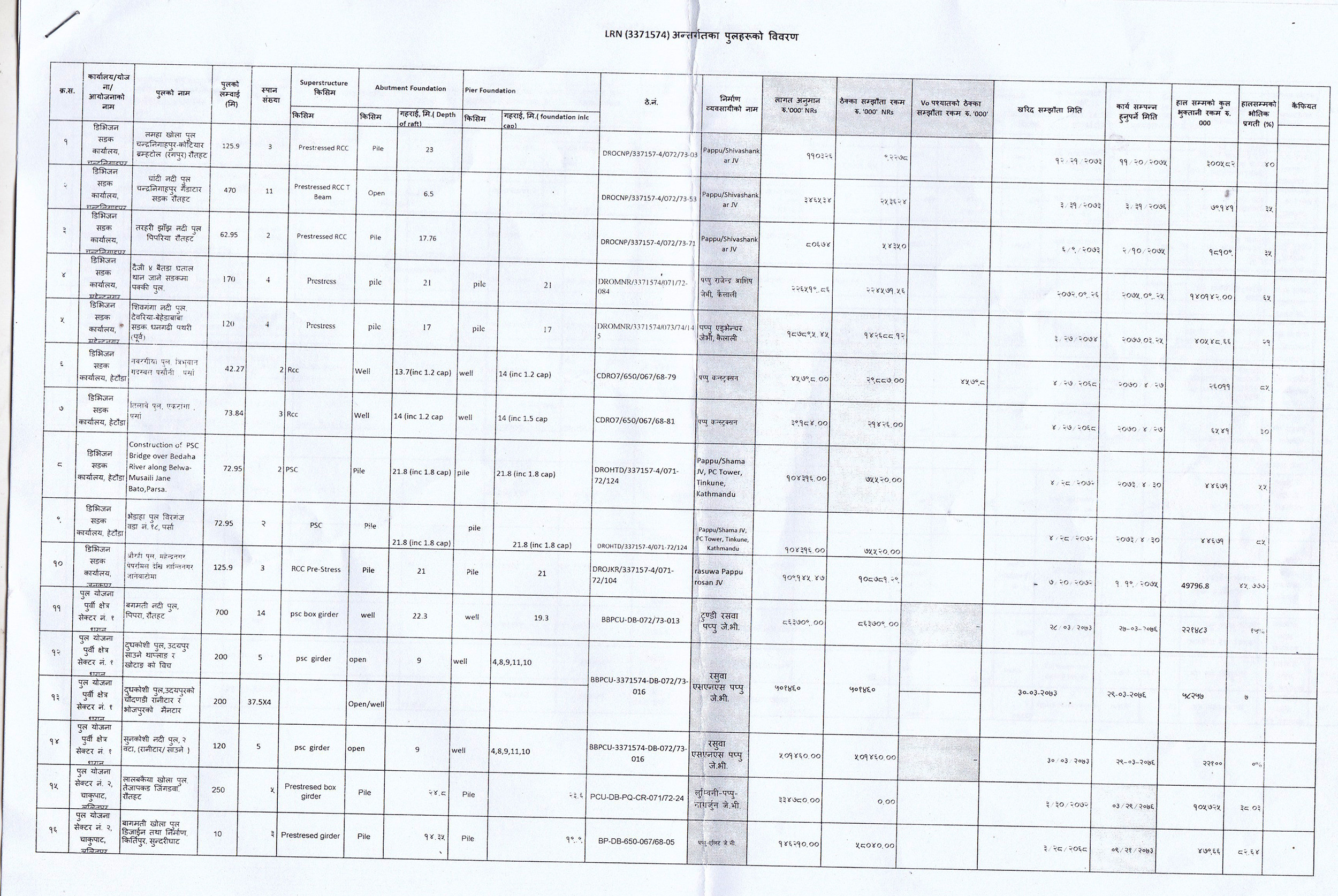 दिनैपिच्छे लगातार पुल निर्माणको ठेक्का दिइएको पनि विवरणमा देखिन्छ। दुई-तीन दिनबीचमै दुई अर्ब २५ करोड ९५ लाख ५९ हजार रुपैयाँको ठेक्का पप्पुलाई दिइएको छ।