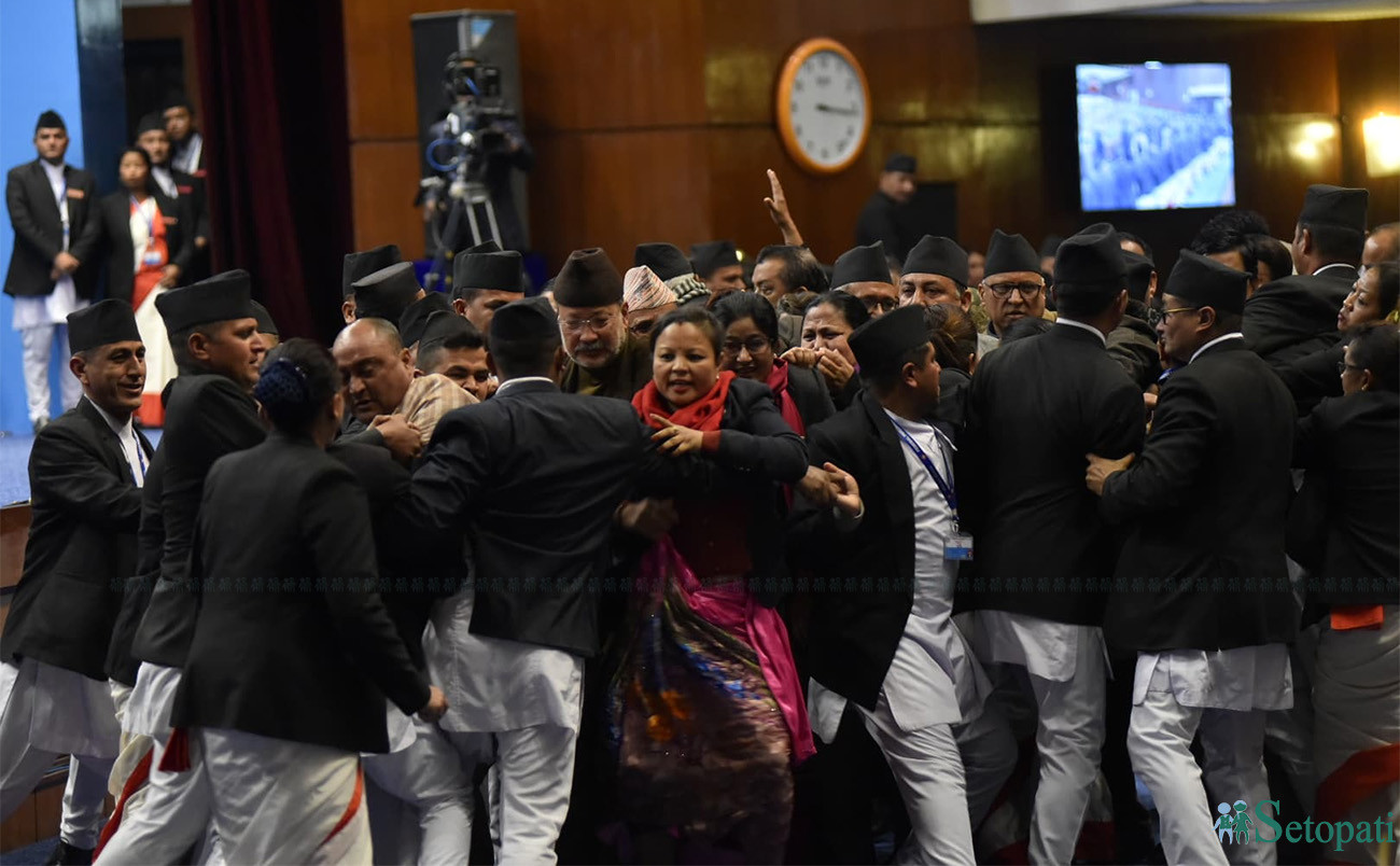 सभामुखले बस्नको लागि आग्रह गर्दा पनि सांसदहरू रोष्ट्रम घेराउ गरिरहे।