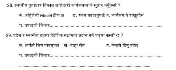 अर्थ समितिले बजेटको विषयमा सुझाव संकलनका लागि तयार गरेको फारममा ‘स्थानीय पूर्वाधार विकास कार्यक्रममा के सुधार गर्नुपर्छ’ भन्दै प्रश्न घुसाएको थियो। प्रश्नमा राखिएका जवाफमध्ये सबैभन्दा धेरै २४२ जनाले रकम बढाउन सुझाव दिएको समितिले सार्वजनिक गरेको तथ्यांक उल्लेख छ।