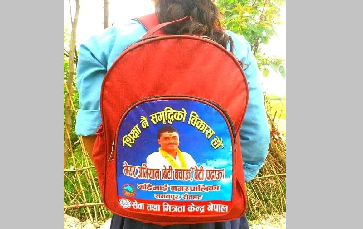 प्रदेश नम्बर २ अन्तर्गत रौतहट समनपुरको गढिमाई नगरपालिकाका मेयरको फोटो विद्यार्थीले बोक्ने झोलामा छापिएका छन्।
