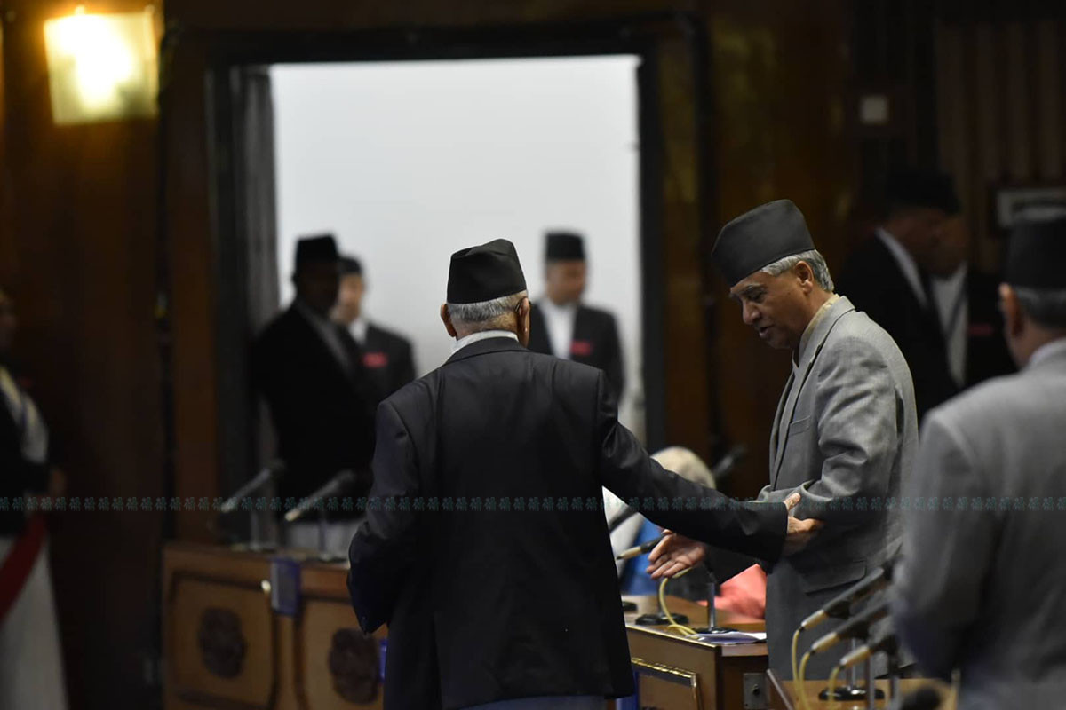 प्रधानमन्त्री ओली र देउवाले केहीबेर कुराकानी गरे। त्यसपछि दुबै जना उठे। प्रधानमन्त्रीले देउवाको हात समाउँदै बाहिर लगे।