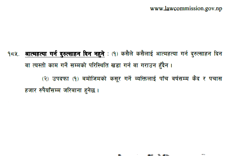 नेपालले गत वर्षदेखि लागू गरेको मुलुकी फौजदारी संहिताको दफा १८५ मा आत्महत्याको दुरुत्साहन गर्नेलाई पाँच वर्षसम्म कैद र पचास हजारसम्म जरिमानाको व्यवस्था छ।