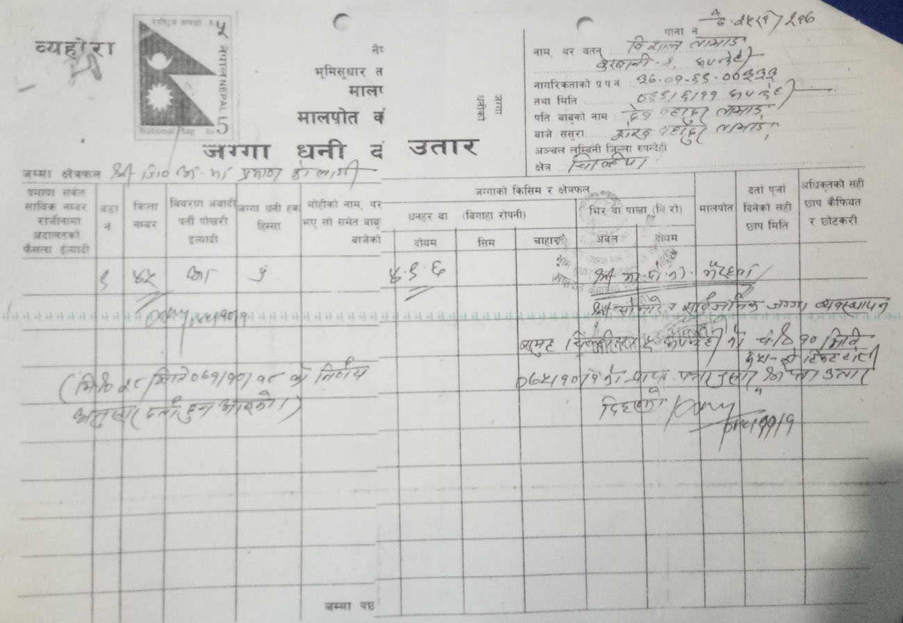 ०७१ सालमा उक्त जग्गा आफ्नो नाममा दर्ता गराएका विशालले लालपुर्जा हराएको भन्दै २०७५ मंसिर २६ गते वडा कार्यालयको सिफारिसमा मालपोत कार्यालयबाटै प्रतिलिपि लिएका छन्।