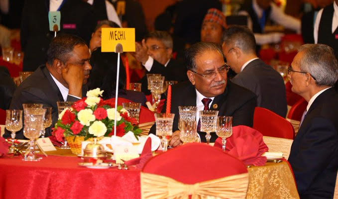 राष्ट्रपति सी र भण्डारी रात्रीभोजमा आइपुग्नु पहिले प्रचण्ड, भट्टराई र यादव एउटै टेबलमा भलाकुसारीमा मग्न देखिन्छन्।