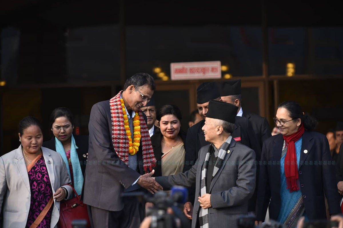 सापकोटा सभामुख भएपछि संसद भवनमै सांसदहरूले खादा लगाएर बधाई दिए।