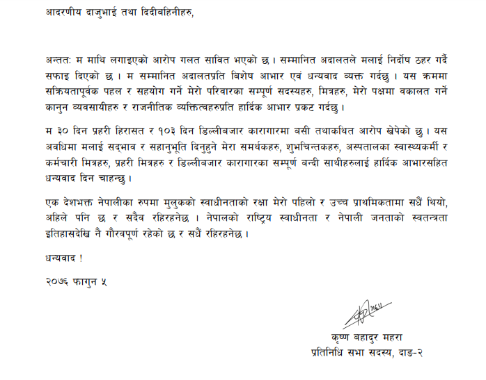 १०३ दिन डिल्लीबजार कारागारमा बसेर छुटेका महराले वक्तव्यमा भनेका छन् ‘एक देशभक्त नेपालीका रुपमा मुलुकको स्वाधिनताको रक्षा मेरो पहिलो र उच्च प्राथमिकतामा सधैं थियो, अहिले पनि छ र सदैव रहिरहनेछ।’