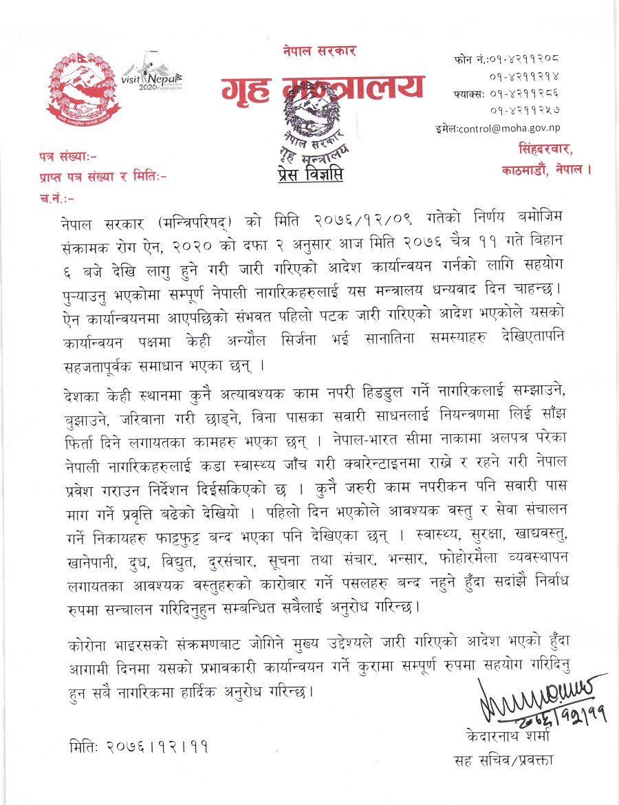 नेपाल–भारत सीमामा अलपत्र परेकालाई प्रवेश दिइएको गृहले जनाएको छ। विज्ञप्तिमा लकडाउनको व्यवस्थालाई कार्यान्वयन गर्न आम नागरिकलाई आग्रह गरिएको छ।