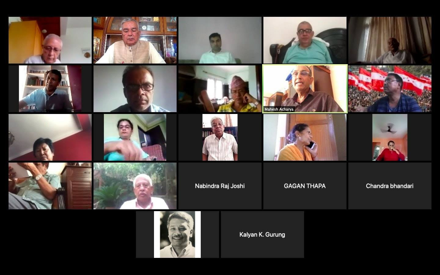 शनिबार करिब तीन घण्टा चलेको भर्चुअल बैठकमा वरिष्ठ नेता रामचन्द्र पौडेल, महामन्त्री शशांक कोइराला, पूर्वमहामन्त्री प्रकाशमान सिंह, केन्द्रीय सदस्यहरू रामशरण महत, अर्जुननरसिंह केसी, शेखर कोइराला, महेश आचार्य, गुरू घिमिरे, चन्द्र भण्डारी, प्रदीप पौडेल, नवीन्द्रराज जोशी, कमला पन्त, जीवन परियार, बद्री पाण्डे, गगन थापा, धनराज गुरूङलगायत सहभागी थिए।