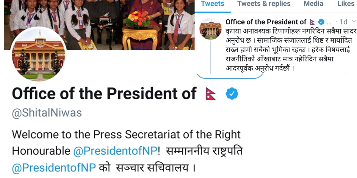 राष्ट्रपतिको छुट्टै ट्विटर ह्याण्डल @presidentofnp सञ्चालनमा छ। त्यसलाई पनि भेरिफाइ गराउने प्रक्रिया अगाडि बढाएको ढकालले बताए।