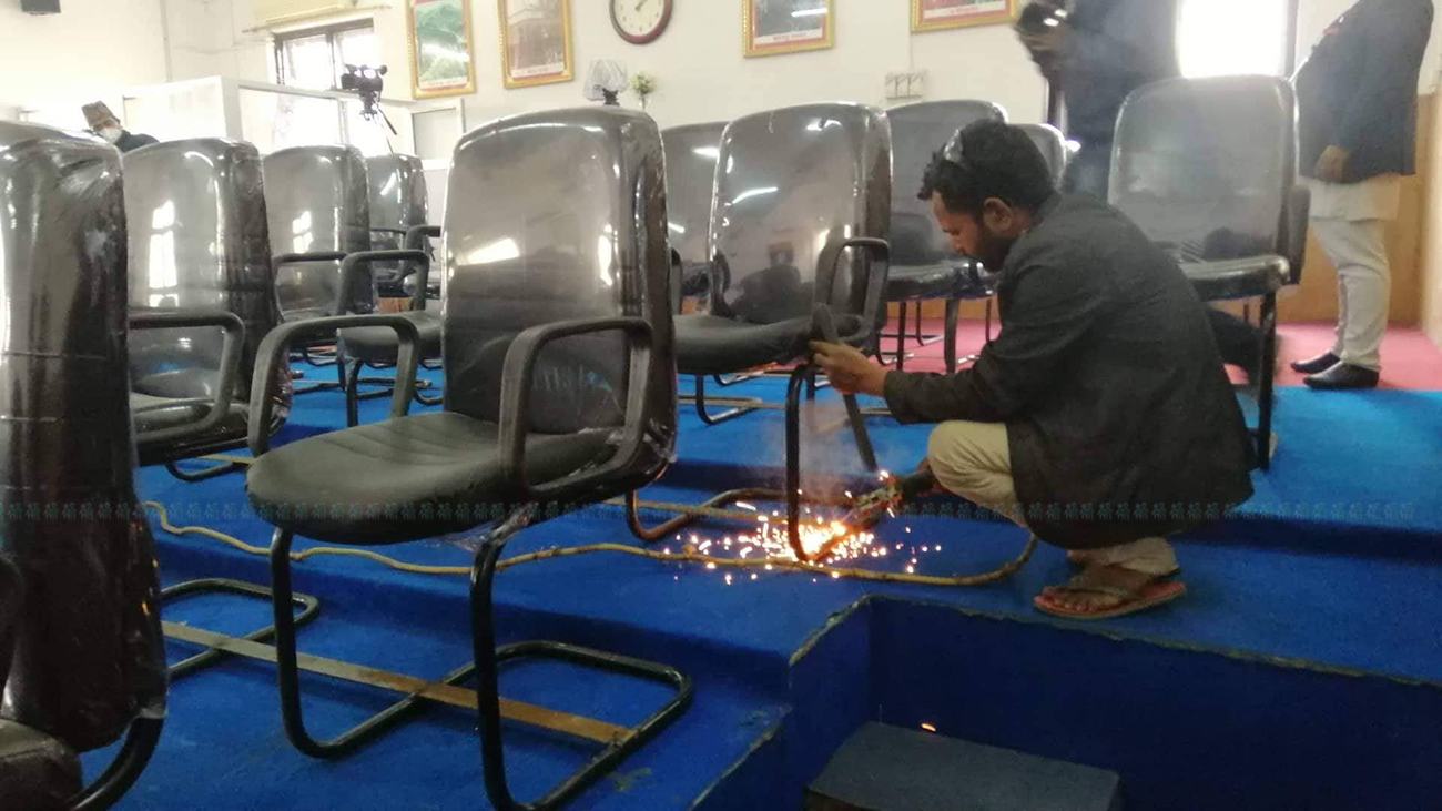 सत्तापक्षका सांसदहरूले कुर्सी तोडफोड गर्ने खतरा भएकै कारण संसदभित्रका सबै कुर्सी वेल्डिङ गरेर उचाल्नै नसक्ने बनाइएको छ। यसअघि संसद भवनका कुर्सी सजिलै उचाल्न मिल्ने खालका थिए।