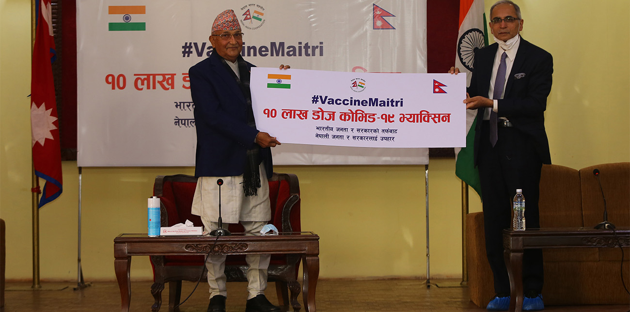 नेपालका लागि भारतीय राजदूत विनयमोहन क्वात्राले प्रधानमन्त्री केपी शर्मा ओलीलाई बिहीबार बालुवाटारमा आयोजित कार्यक्रममा भारत सरकारको तर्फबाट उपहार स्वरूप कोरोनाविरूद्धको १० लाख डोज खोप हस्तान्तरण गरेका हुन्।