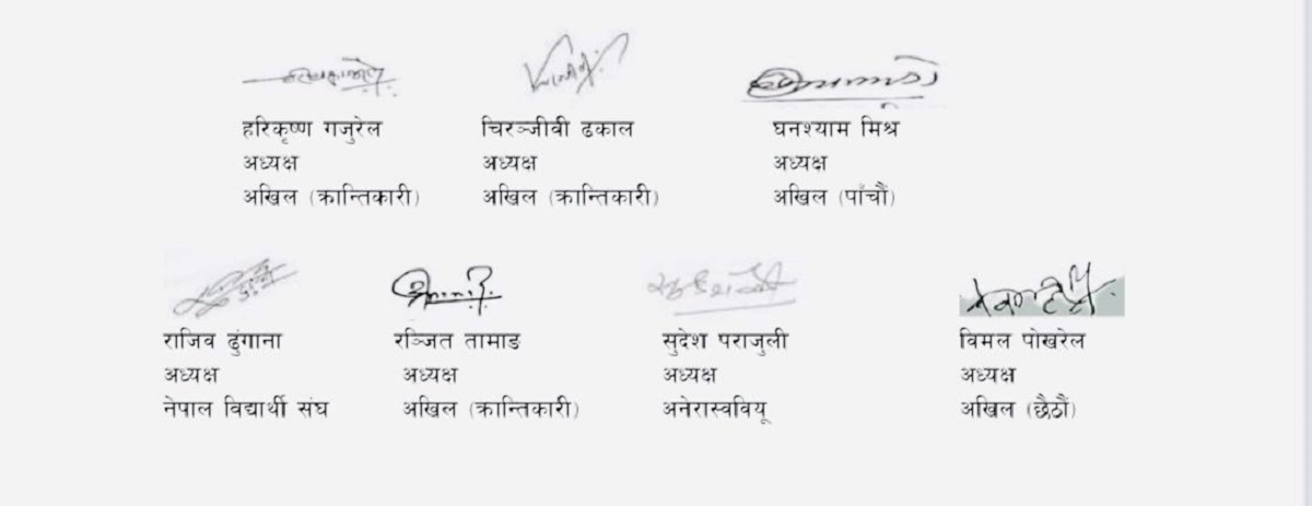 विज्ञप्तिमा नेविसंघ अध्यक्ष राजिव ढुंगाना, अखिल (क्रान्तिकारी)का अध्यक्ष रञ्जित तामाङ, अनेरास्ववियुका अध्यक्ष सुदेश पराजुली, (अखिल क्रान्तिकारी) का अध्यक्ष हरिकृष्ण गजुरेल, अखिल (क्रान्तिकारी) का अध्यक्ष चिरञ्जीवि ढकाल, अखिल (पाँचौं) का अध्यक्ष घनश्याम मिश्र, अखिल (छैटौं)का अध्यक्ष विमल पोखरेलले हस्ताक्षर गरेका छन्।