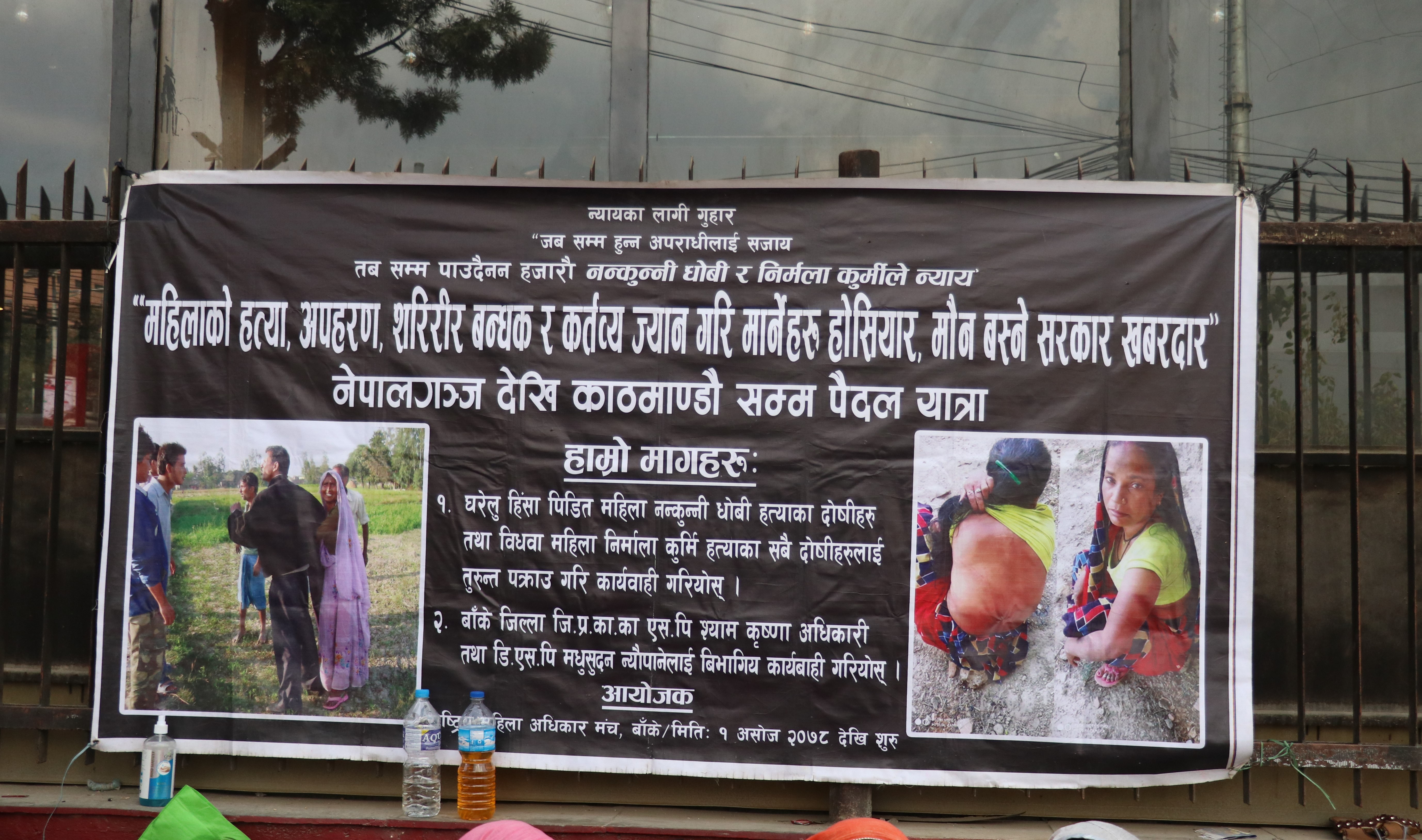 बाँकेमा भएको महिला हिंसाका दोषीलाई कारबाही गर्न र ती दोषीमाथि कारबाही प्रक्रिया नबढाउने जिल्ला प्रहरी कार्यालय बाँकेका एसपी श्यामकृष्ण अधिकारी र डिएपी मधुसुदन न्यौपानेलाई विभागीय कारबाही गर्न अधिकारकर्मीहरूले माग गरेका छन्। माग पूरा नहुञ्जेल धर्ना जारी रहने उनीहरूले बताएका छन्।