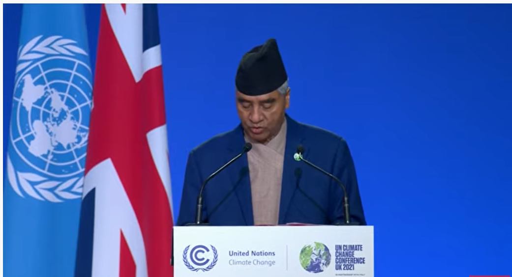 जलवायु परिवर्तनसम्बन्धी २६ औँ अन्तर्राष्ट्रिय सम्मेलन (कोप–२६) मा सहभागी विश्व नेताहरुको शिखर बैठकमा प्रधानमन्त्री देउवाले हिमाली क्षेत्रमा तीव्र गतिमा उष्णता बढेर समग्र दक्षिण एशियामै खाद्य, जल, ऊर्जा र मानवीय सुरक्षामा गम्भीर चुनौती खडा गरेको र हिमतालहरु पग्लेर समुद्री सतह बढ्न जाँदा तटीय र टापू राष्ट्रहरुको अस्तित्व सङ्कटमा पर्न थालेको सन्दर्भ अघि सार्दै यस्तो आग्रह गरेका हुन्।