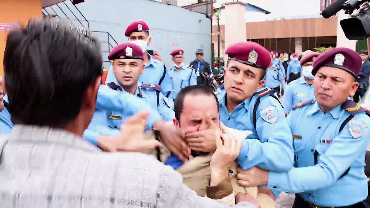 प्रधानमन्त्री एवं नेकपा (माओवादी केन्द्र) का अध्यक्ष पुष्पकमल दाहाल ‘प्रचण्ड’ सहभागी कार्यक्रममा नाराबाजी गर्ने तीन जना युवालाई नियन्त्रणमा लिँदा प्रहरीले उनीहरूलाई सासै फेर्न मुस्किल हुने गरी नाक-मुख थुनिदियो।
