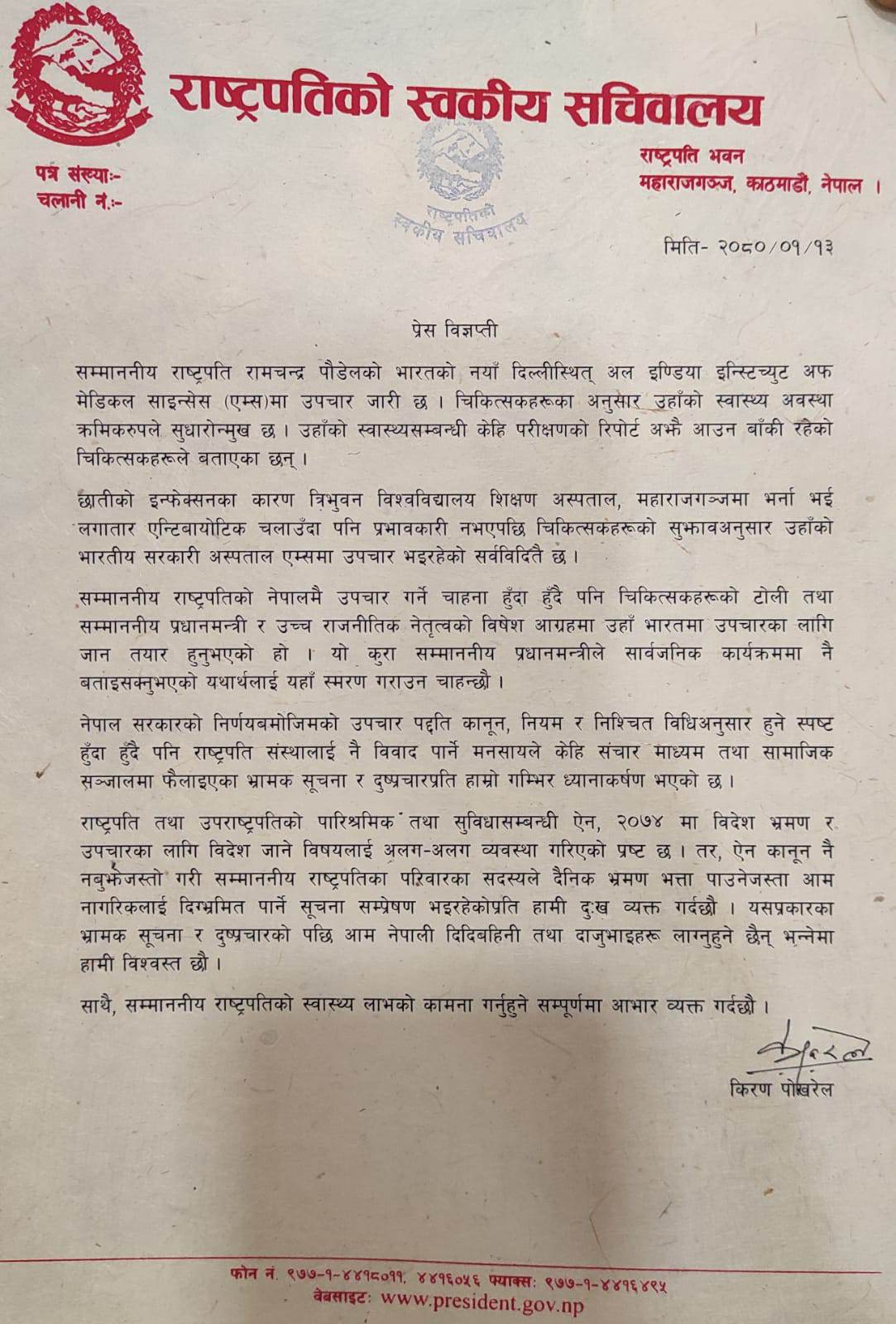 यसअघि राष्ट्रपति सचिवालयले विज्ञप्ति निकालेर राष्ट्रपतिको उपचार खर्चबारे सामाजिक सञ्जालमा भ्रमपूर्ण विवरण आएको उल्लेख गरेको थियो।