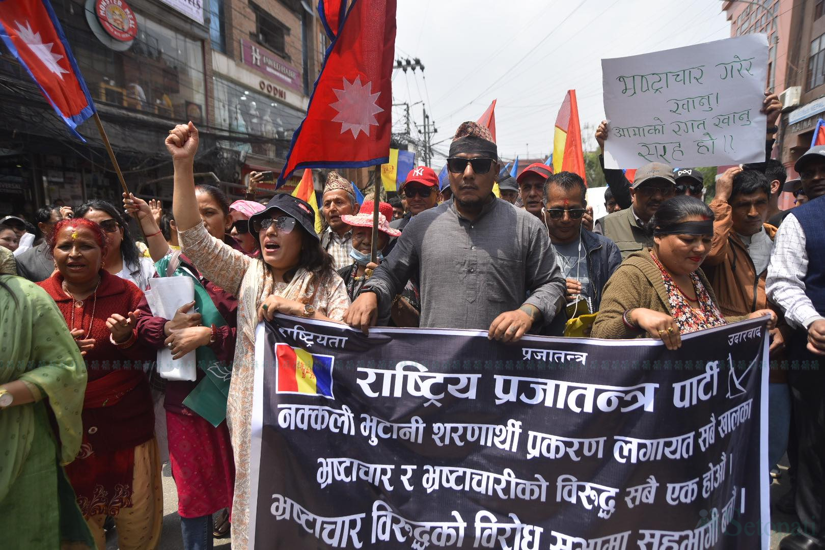 बिहीबार काठमाडौंको बसन्तपुरमा राप्रपाले प्रदर्शन गरेको हो। प्रदर्शनको क्रममा कार्यकर्ताले नक्कली भुटानी शरणार्थी प्रकरण लगायत सबैखालका भ्रष्टाचारविरूद्ध एक हौं भन्ने नारा समेत लगाएको छ।