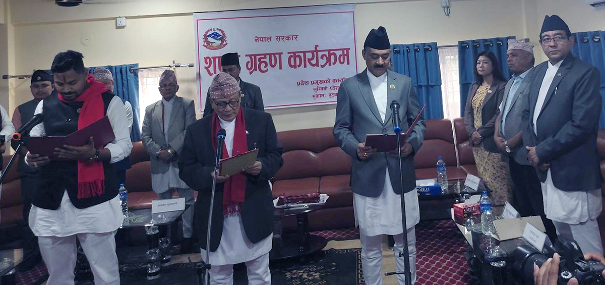 नवनियुक्त मन्त्रीहरूलाई प्रदेश प्रमुख कार्यालय बुटवलमा प्रदेश प्रमुख अमिक शेरचनले पद तथा गोपनीयताको शपथ ग्रहण गराएका हुन्।