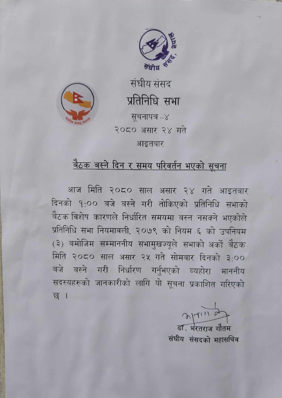 संसद् सचिवालयले सूचना टाँस गरेर सोमबारसम्मलाई बैठक स्थगित भएको बताएको हो।