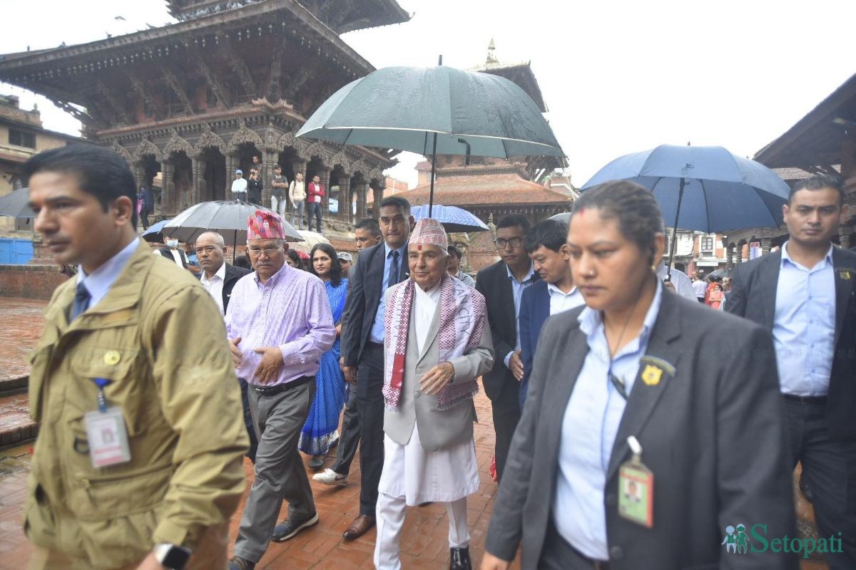 पाटन दरबार क्षेत्रमा सिमसिम पानी पर्दा राष्ट्रपति पौडेलले छाता ओढेर दरबार क्षेत्रको अवलोकन गरेका छन्।