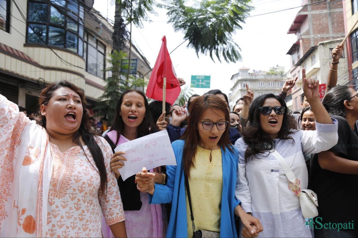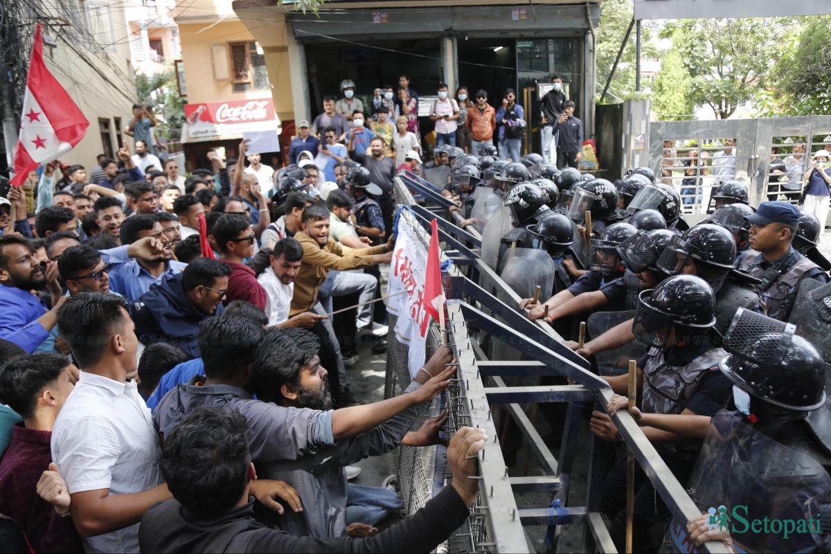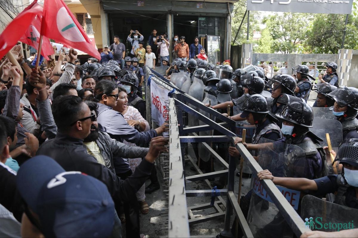 उनीहरूले निषेधित क्षेत्र तोडेर अगाडि बढ्न खोजेपछि केहीबेर सुरक्षाकर्मी र प्रदर्शनकारीबीच धकेलाधकेल भएको थियो।