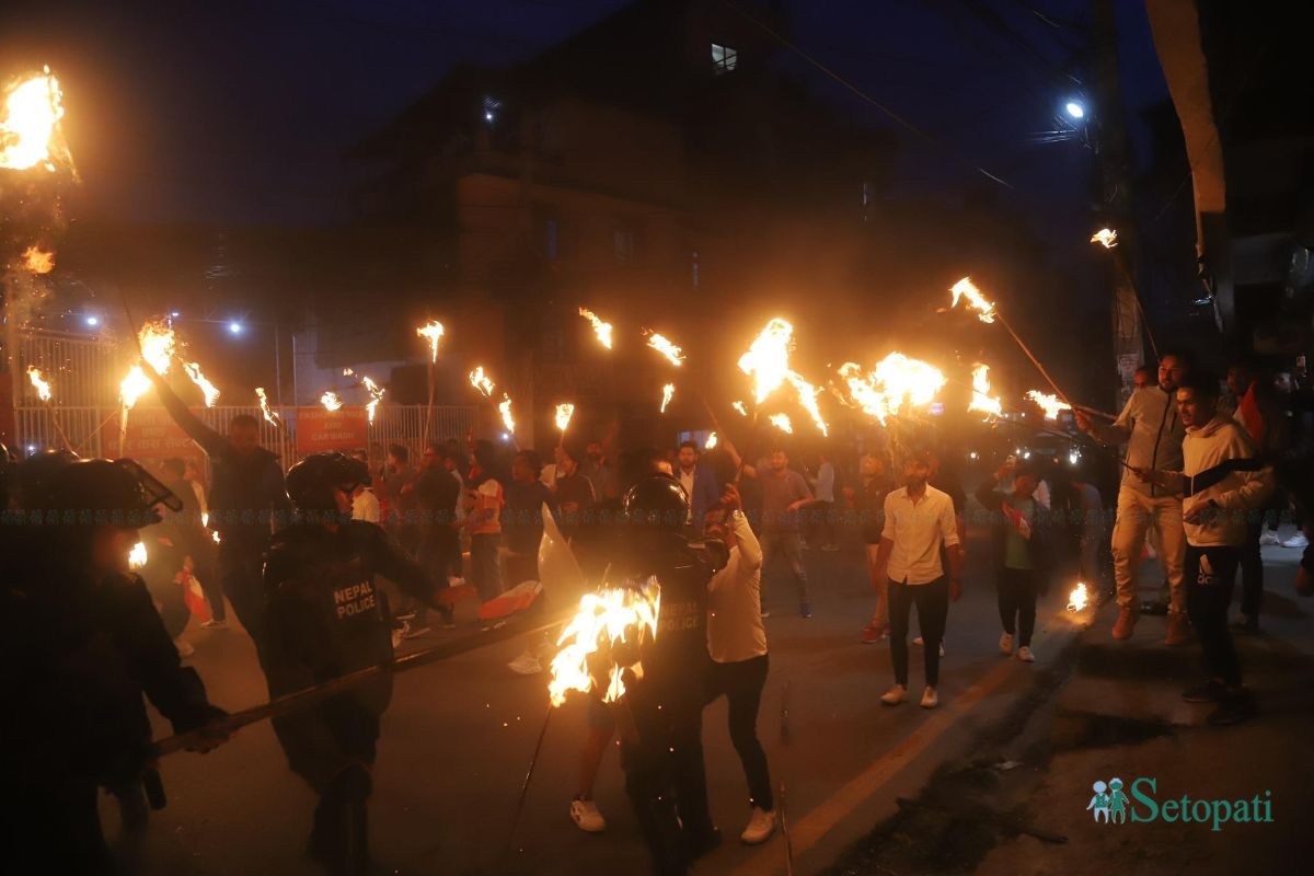 सोमबार राति काठमाडौं चाबहिलको पशुपति कलेजबाट तरूण दलका केन्द्रीय सदस्य प्रेम शाही नेतृत्वमा मसाल जुलुस निकालिएको हो। प्रदर्शनमा अन्दाजी ३० जना भेला भएका थिए।