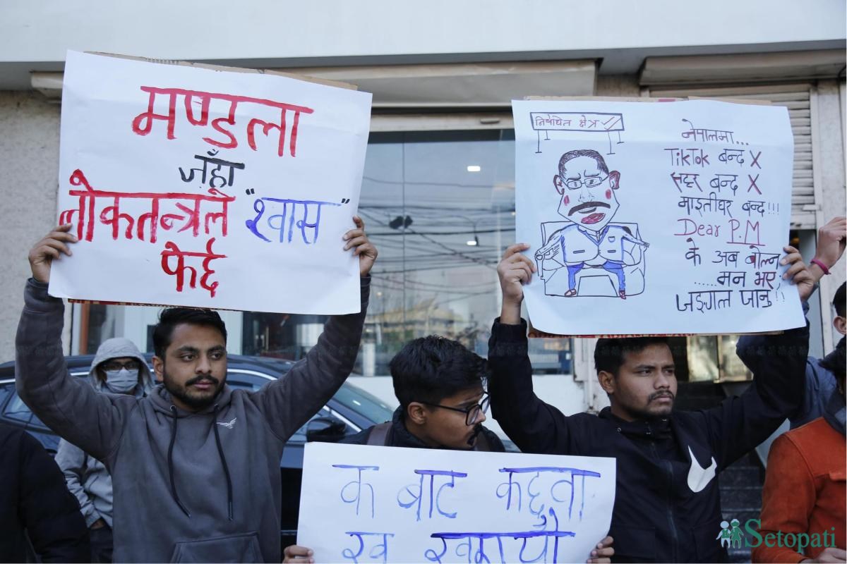 सत्तारूढ नेपाली कांग्रेसको भ्रातृ संस्था नेविसंघले माइतीघर मण्डलमा लगाएको निषेधाज्ञा हटाउन माग गर्दै प्रदर्शन गरेका छन्।