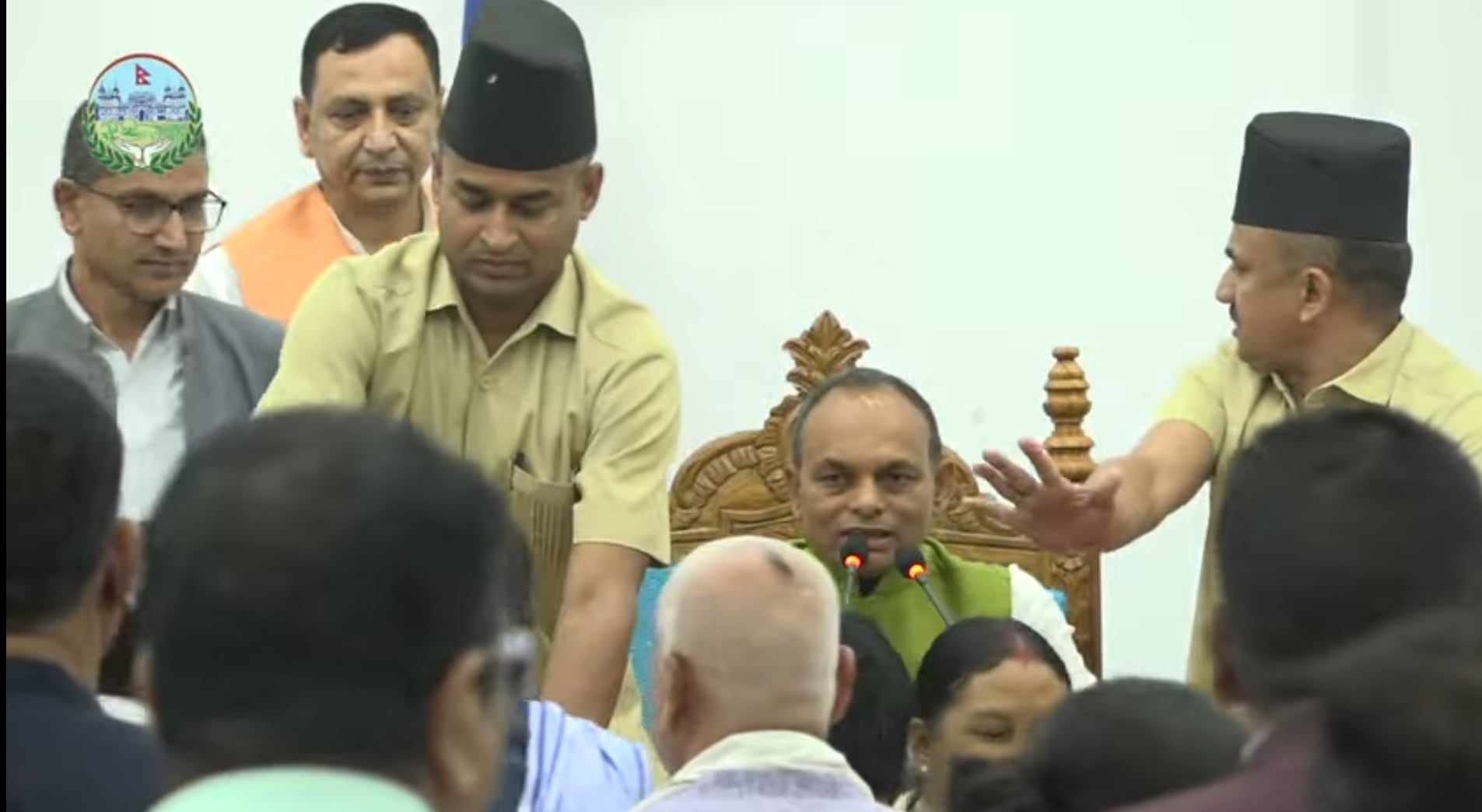 प्रदेश सभाभित्र जनमतका सांसद र मर्यादापालकबीच धकेलाधकेल हुँदै हातपात हुने स्थिति सिर्जना भएपछि सभामुख रामचन्द्र मण्डलले फेरि १० मिनेटका लागि प्रदेश सभा बैठक स्थगित गरेका छन्।
