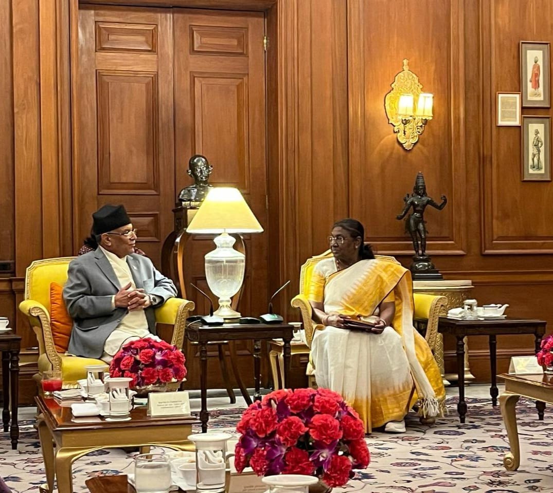 नयाँ दिल्लीस्थित राष्ट्रपति भवनमा सोमबार प्रधानमन्त्री प्रचण्डले राष्ट्रपति मुर्मुसँग भेट गरेका थिए।