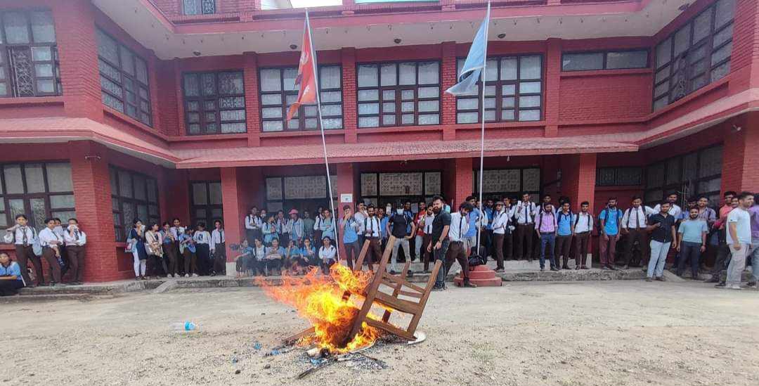 नेकपा माओवादी केन्द्र निकट अखिल क्रान्तिकारीका केन्द्रीय कमिटी प्रमुख सचिव अभयप्रताप चौबेको नेतृत्वमा विद्यार्थीले कुलसचिव अधिकारी बस्ने कुर्सी विश्वविद्यालय प्राङ्गणमा जलाएका हुन्।