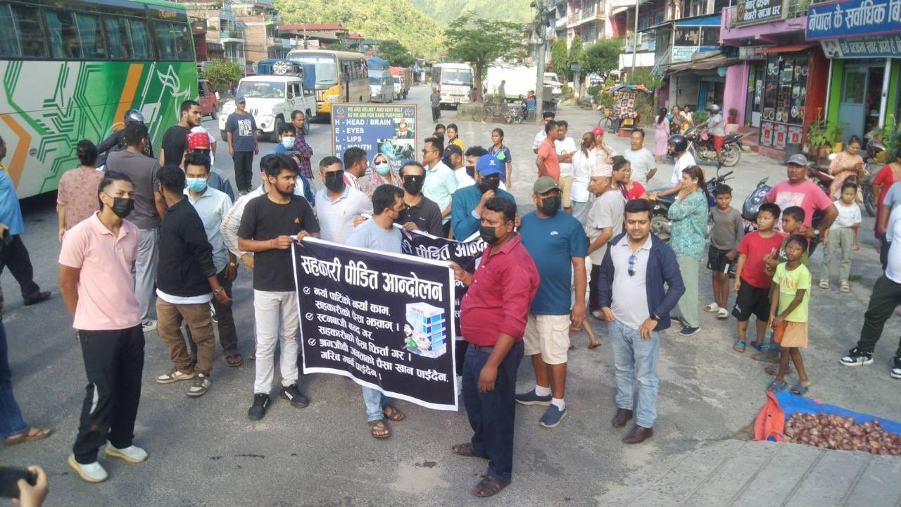 सामाजिक सञ्जालमा बाहिरिएको भिडिओमा कालो फ्लेक्समा सहकारी पीडितको रकम फिर्ता गर्न माग गरी प्रदर्शन गरेको देखिन्छ।