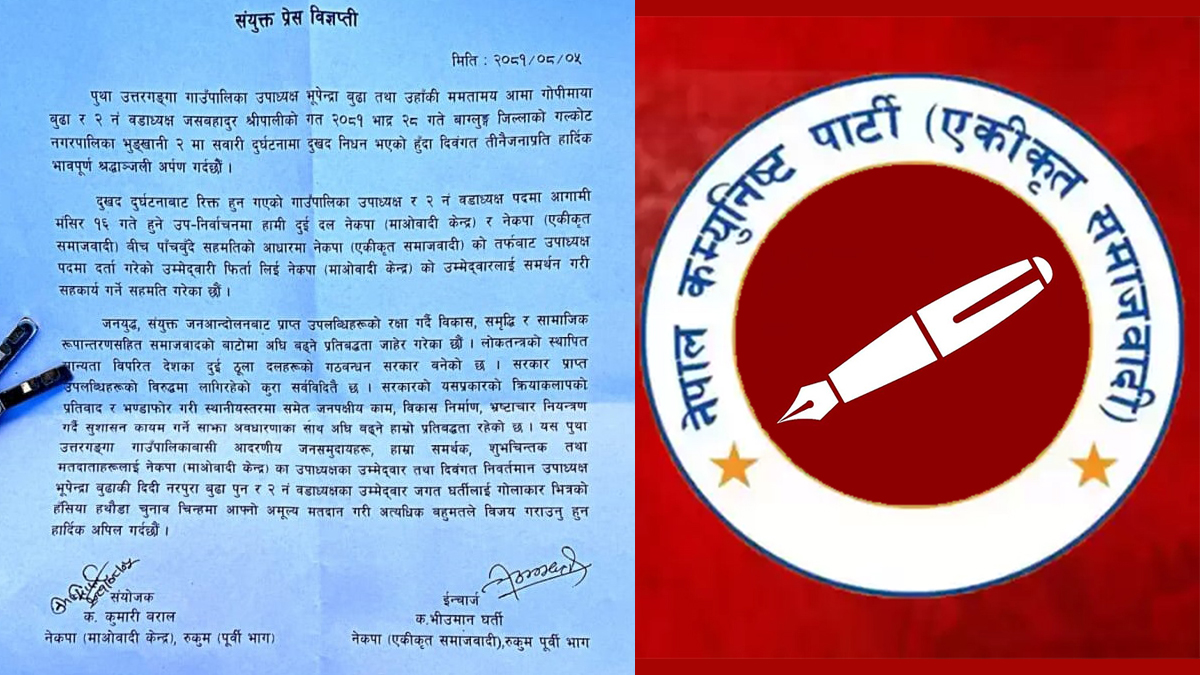 बुधबार माओवादी केन्द्रको पूर्वी रूकुम संयोजक कुमारी बराल र एकीकृत समाजवादीको इन्चार्ज भीउमान घर्तीले संयुक्त विज्ञप्ति जारी गर्दै सहकार्यको सहमति भएको जानकारी दिँदै निर्वाचनमा माओवादी केन्द्रका उम्मेदवारलाई मतदान गर्न आफ्ना मतदाताहरूलाई आह्वान गरेका छन्।