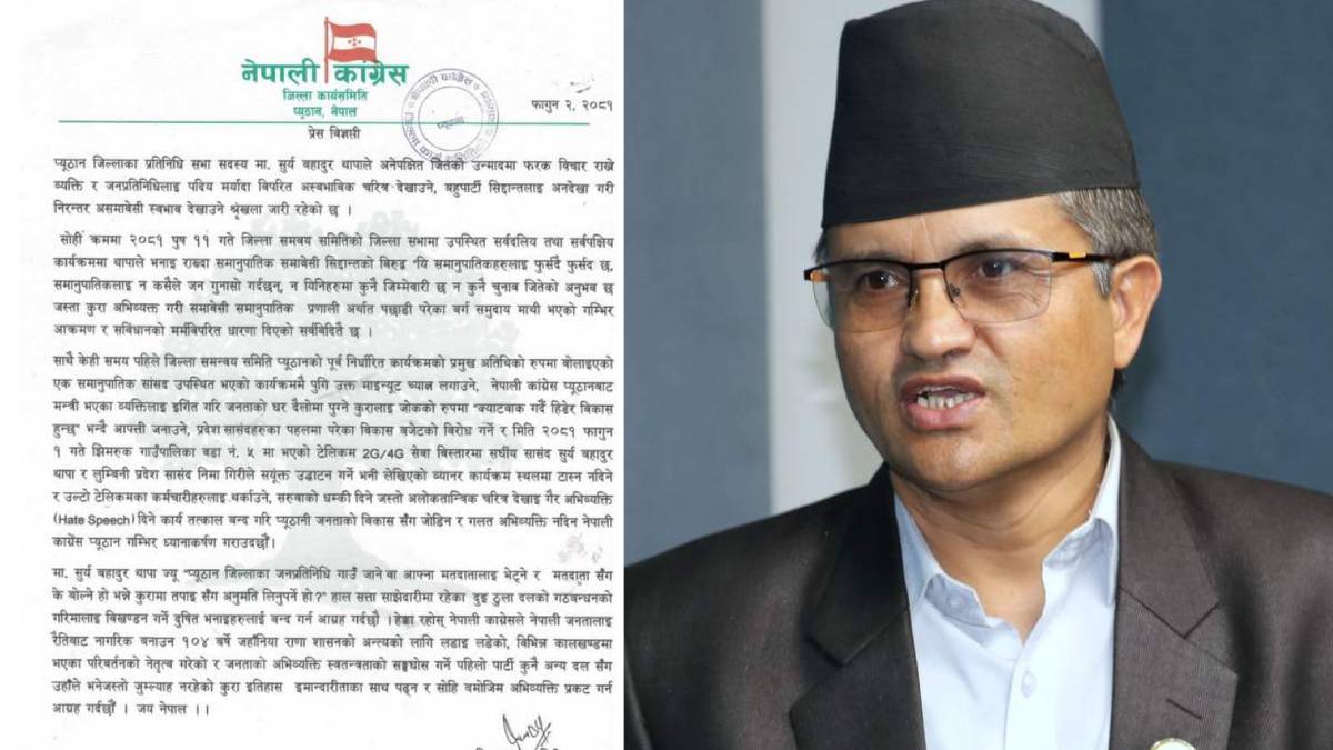 नेपाली कांग्रेस प्यूठानले प्यूठानले नेकपा एमालेबाट निर्वाचित प्रतिनिधि सभा सदस्य सूर्यबहादुर थापाका व्यवहार र गतिविधिको विरोध गरेको छ।