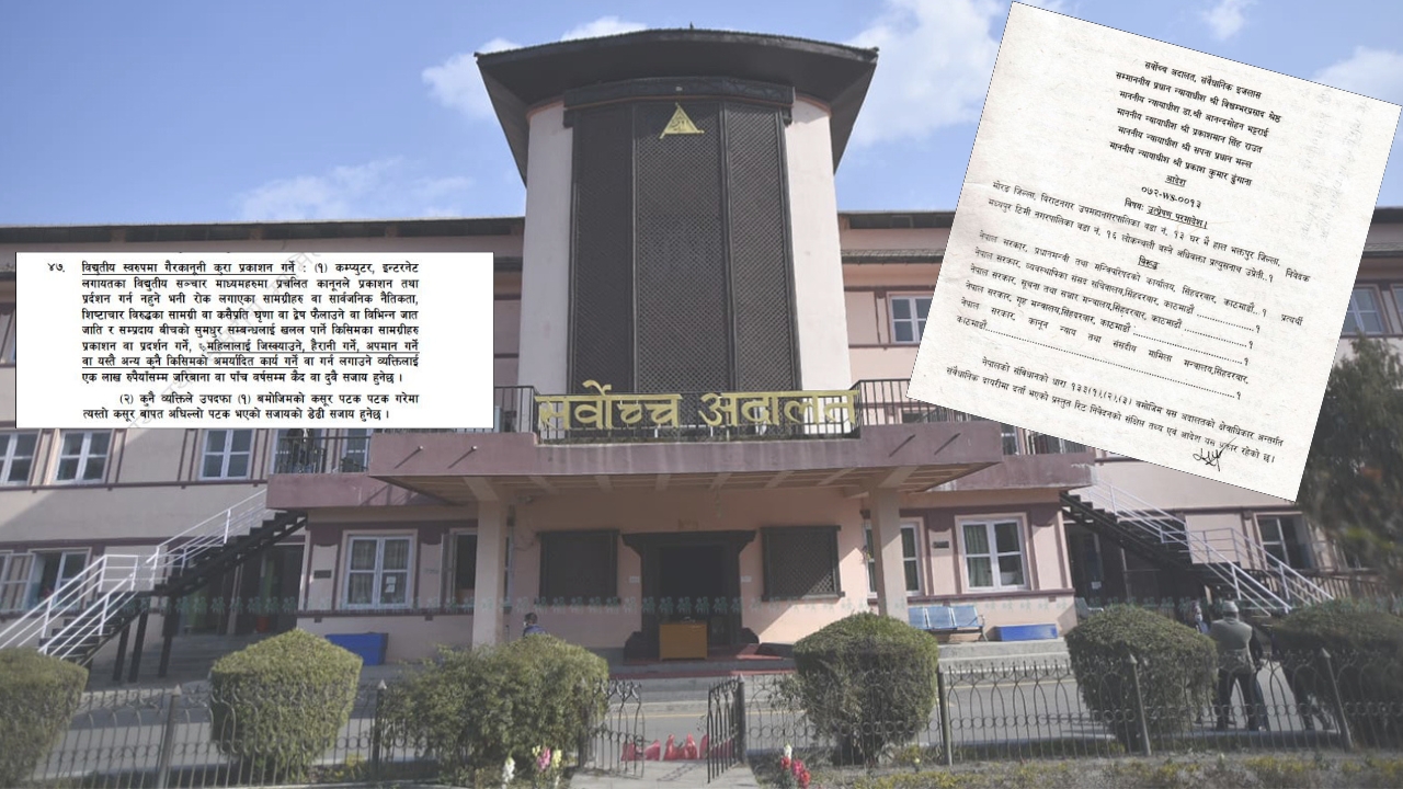 विद्युतीय (इलेक्ट्रोनिक) कारोबार ऐन, २०६३ को दफा ४७ संविधानको मौलिक हकसँग बाझिएको छ वा छैन भन्ने विषयमा परेको रिटमा सर्वोच्चको फैसला सार्वजनिक भएको छ।