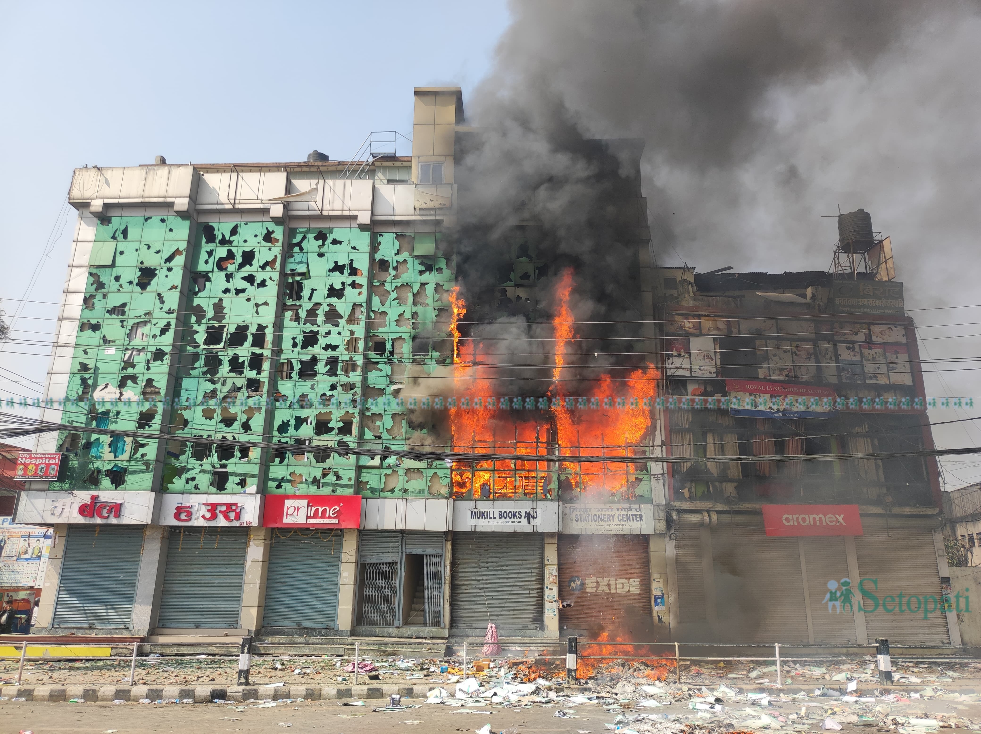 प्रदर्शनकारीहरूले तीनकुनेको एउटा निजी भवनमा ढुंगा हानेर तोडफोड गर्नुका साथै आगो लगाइदिएका थिए। उक्त आगो निभाउन आइरहेको दमकलको बाटो छेक्न उनीहरूले ढुंगा हानेका हुन्।