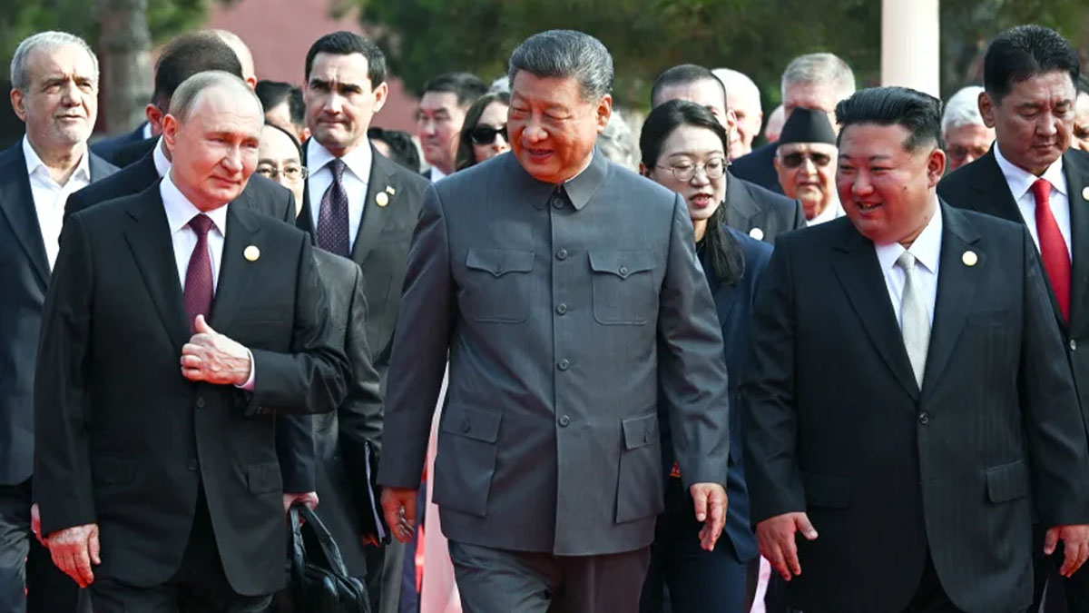मञ्चतर्फ जाँदै गर्दा अघिल्लो पंक्तिमा चिनियाँ राष्ट्रपति सी, रूसी राष्ट्रपति पुटिन र उत्तर कोरियाली सर्वोच्च नेता किम जोङ उन थिए।