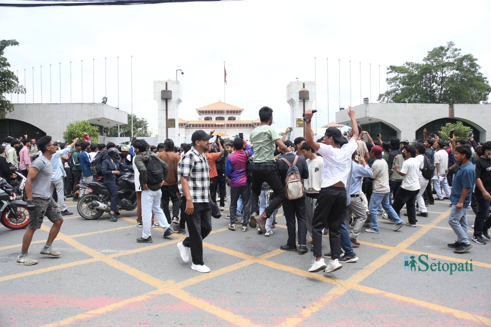 केही युवाहरू प्रहरी बस्ने गार्ड हाउस माथि चढेका छन्। उनीहरूमाथि पनि प्रहरीले अश्रुग्यास प्रहार गरेको छ।