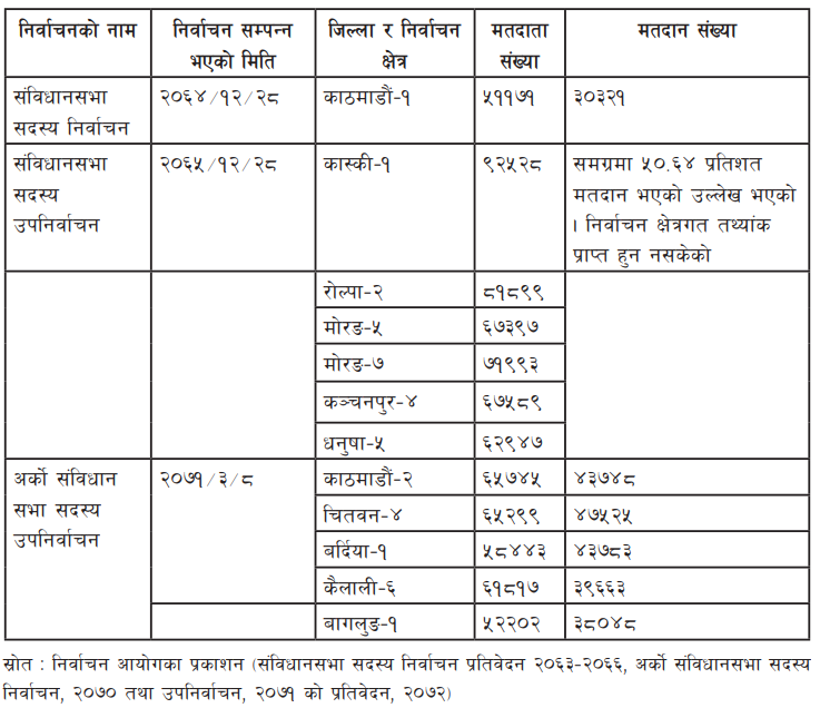 त्यसपछि २०६५ चैत २८ मा भएका ६ वटा उपनिर्वाचनमा पनि भोटिङ मेसिन प्रयोगमा ल्याइयो। मोरङ क्षेत्र नम्बर ५ र ७, धनुषा–५, कास्की–१, रोल्पा–२ र कञ्चनपुर–४ मा विद्युतीय मेसिन प्रयोग गरेर मतदान भएको थियो।
