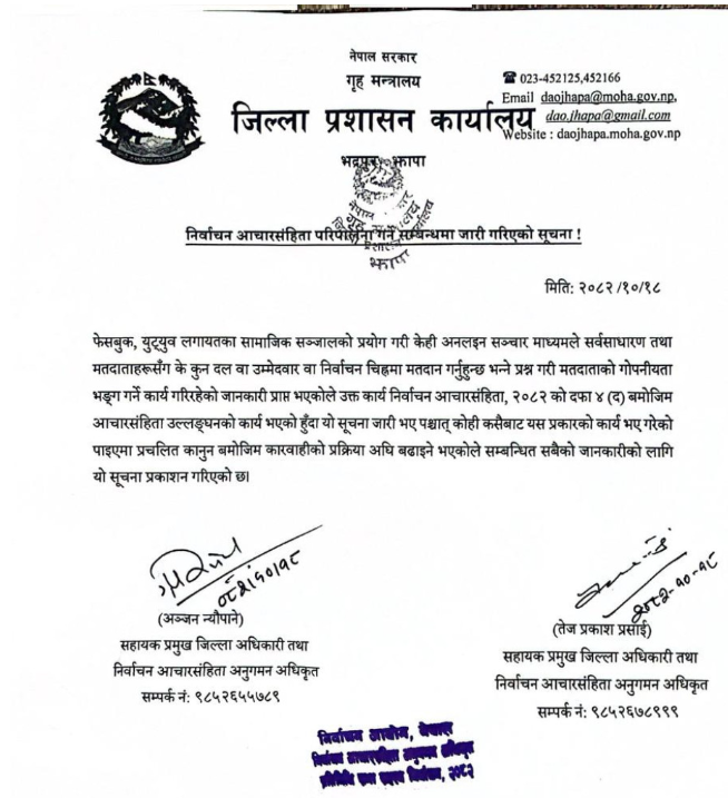 जिल्ला प्रशासन कार्यालय झापाले मतदाताहरूलाई ‘कुन उम्मेदवार र कुन चिह्नलाई मत दिनुहुन्छ भनेर सोध्न नपाउने निर्णय गरेको छ।