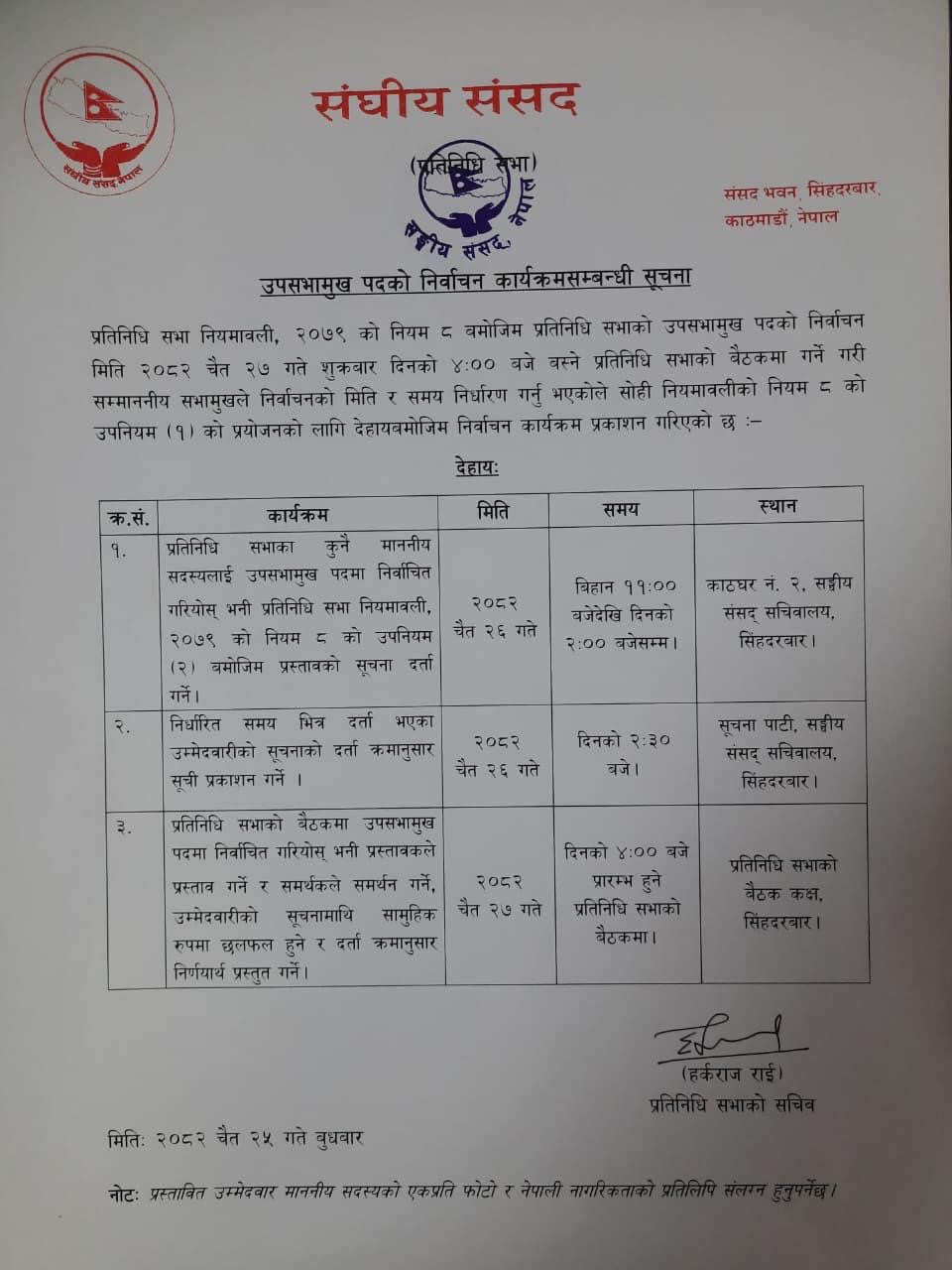 प्रतिनिधि सभाले उपसभामुख पदका लागि निर्वाचन कार्यक्रम प्रकाशित गरेको छ।