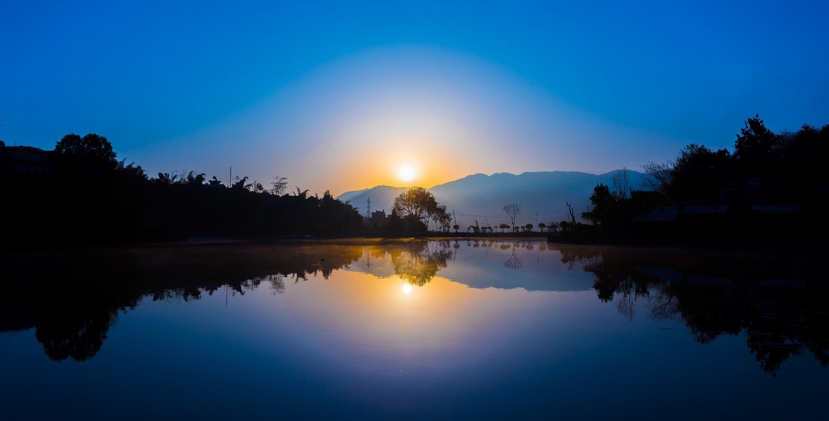 पर्खाइ थियो घामको। पहाडले छेकेको घाममाथि आइपुग्नुभन्दा पहिला आकाश र पोखरीमा छरिएको निलो रंग समात्नु थियो क्यामराले। तर खिच्दै खिच्दै घाम रंगलाई मिच्दै आइपुग्यो। खासमा खिच्नु थियो निलो रंग। तर घामसँग सकिएन।