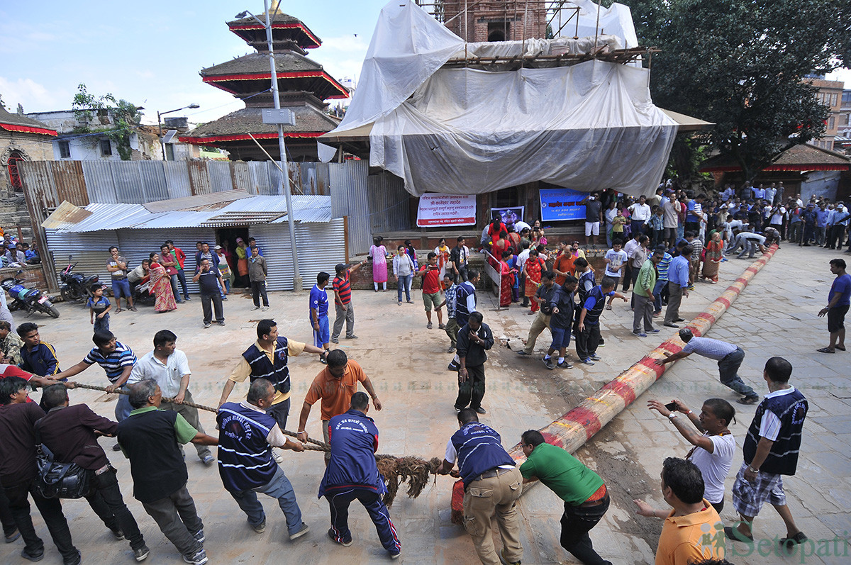 उपाध्यक्ष मानन्धरका अनुसार पहिलो दिन नालाबाट रूख तानेर ठिमीको राधेराधेसम्म ल्याउने चलन छ। त्यसपछि चौथीको दिन त्यहाँबाट तानेर काठमाडौंको भोटाहिटी ल्याइन्छ।