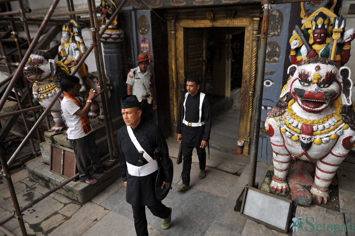 इन्द्रजात्रा सुरु भएको सन्देश दिँदै मंगलबार खुला गरिएको भोटाहिटी सडकछेउको मण्डल। भक्तपुर, नालाबाट ल्याइने लिंगो यही मण्डलमा पूजा गरी नगर प्रवेश गराइन्छ। तस्बिर: सबिना श्रेष्ठ/सेतोपाटी