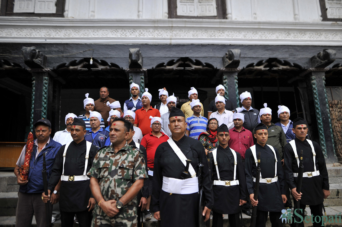 इन्द्रजात्रा निम्ति बुधबार भक्तपुरको नालामा रुख काट्न जाने तयारी गर्दै मानन्धर गुठीका सदस्य। तस्बिरः नारायण महर्जन/सेतोपाटी