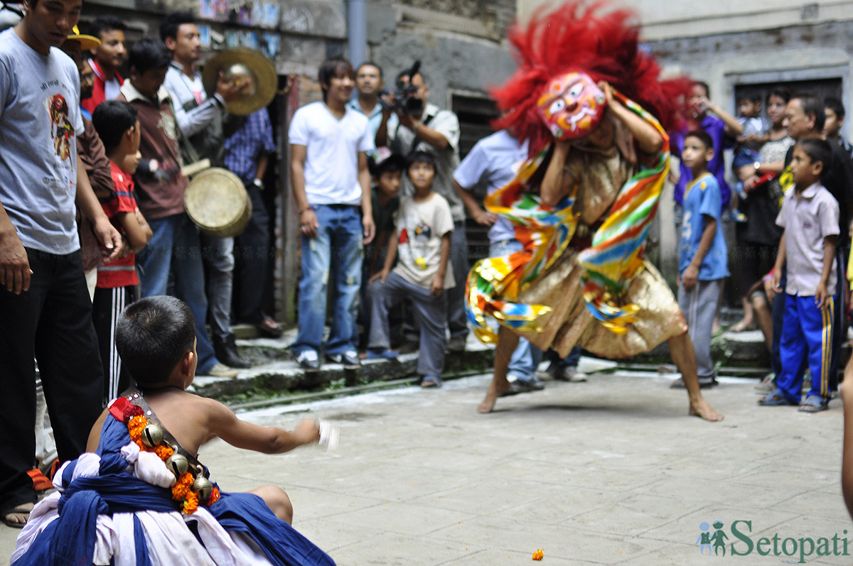 येँया पुन्ही (इन्द्रजात्रा) मा मजिपाः लाखेलाई जिस्क्याउँदै झ्यालिँचा। तस्बिरः नारायण महर्जन/सेतोपाटी